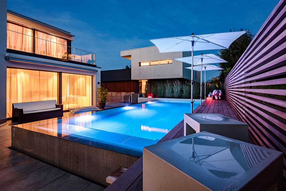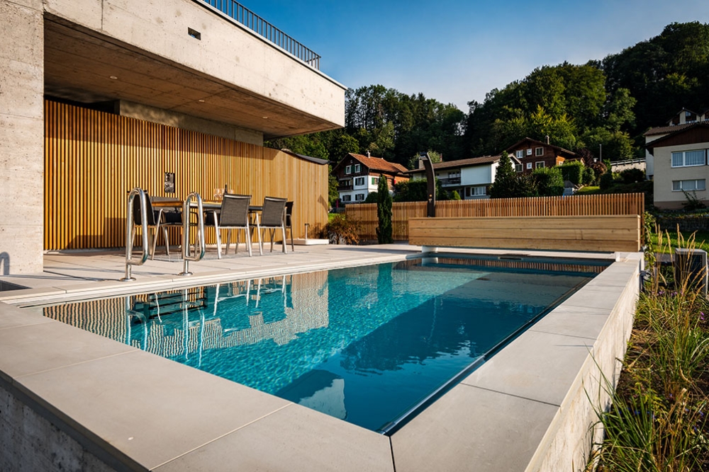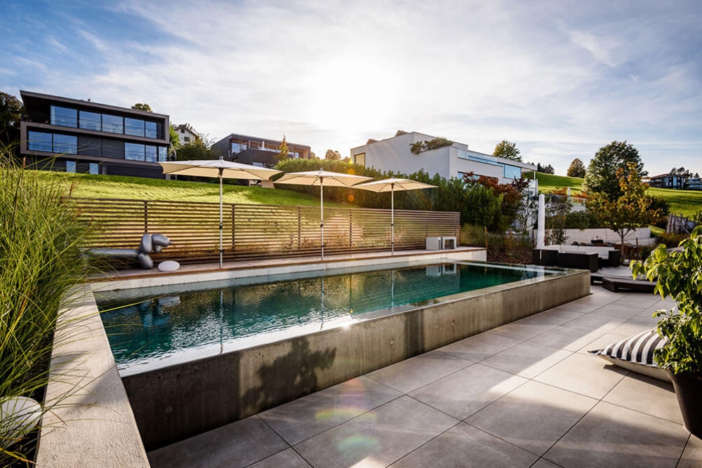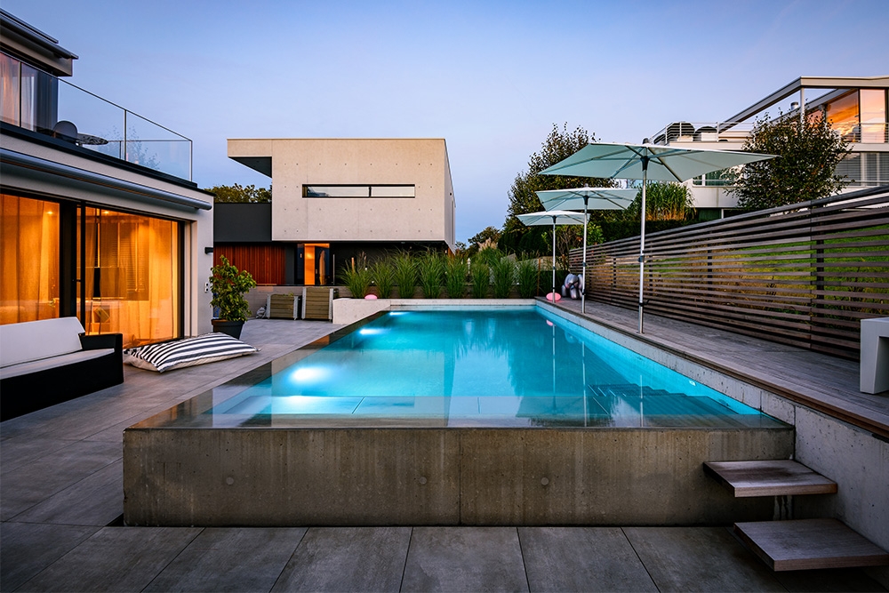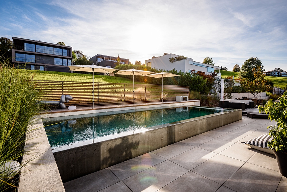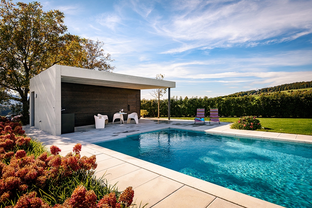 Wer grenzenlose Individualität schätzt, der entscheidet sich für ein Betonbecken. Von der Form bis zur Ausstattung können bei diesem Schwimmbad Wünsche und bereits vorhandene Gebäudestrukturen berücksichtigt werden. Die massive Bauweise sowie die Vielfalt an Ausbaumöglichkeiten und Materialien versprechen Freude für viele Jahre.